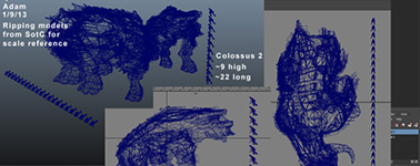 - Models (characters and environments) were ripped from The Legend of Zelda: Skyward Sword and Shadow of the Colossus and imported/cleaned up in Maya