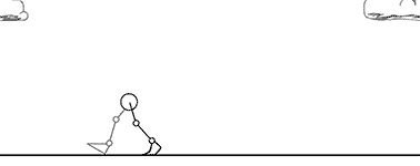 One of two animations for this assignment. We exported our PAP animations out as frames, imported those frames into Flash, traced them (and possibly improved them), and created a Flash armature (set of bones) from them. We were to first animate the cycle so that it didn’t move across the screen. This way, we could get the loop to look right. Next, we were to translate this animation across the screen. Of course, we had to make it look right. Legs do not simply float across the land (though mine does a little floating here and there >_>)!