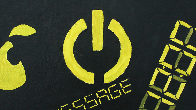 This was the first project for our WARP class. It was also the first time I had really painted anything. Each student was to write down six verbs and put them in a hat. Then, everyone would pick six verbs out of the hat. Additionally, each student was given a color (picked from a book) at random. The project was to create six unique paintings, one for each verb, all using the assigned color as the dominant color. My verbs were “capture,” “connect,” “discharge,” “extort,” “move,” and “shine,” and my color was this really nasty green (the teachers called it “puke” green). However, I soon discovered that this “puke” green was nearly the exact same color as lights that are often found on electronics, so I based three of my verbs around that.